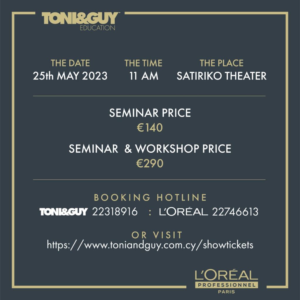 Ο επαρχιακός σύνδεσμος Λευκωσίας σας ενημερώνει ότι στις 25 Μαίου θα διεξαχθεί στην πόλη μας το πιο κάτω σεμινάριο. Αποκλειστικά ο καλύτερος διεθνώς κομμωτής του 2023 Cos Sakkas απο την Toni&Guy Academy London με την International Art Director Efi Davies και την International Technical Director στο χρώμα Michela Bazzoli στην Λευκωσία στο Σατιρικό Θέατρο. Oσοι επιθυμείτε να προμηθευτείτε εισιτήρια μπορείτε να το κάνετε διαδικτυακά στον πιο κάτω σύνδεσμο ή στα τηλέφωνα που βλέπετε. http://www.toniandguy.com.cy/